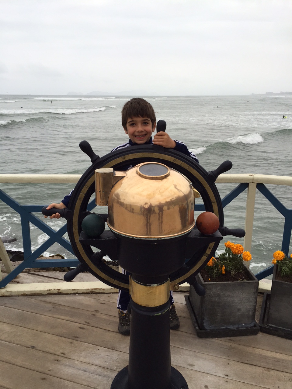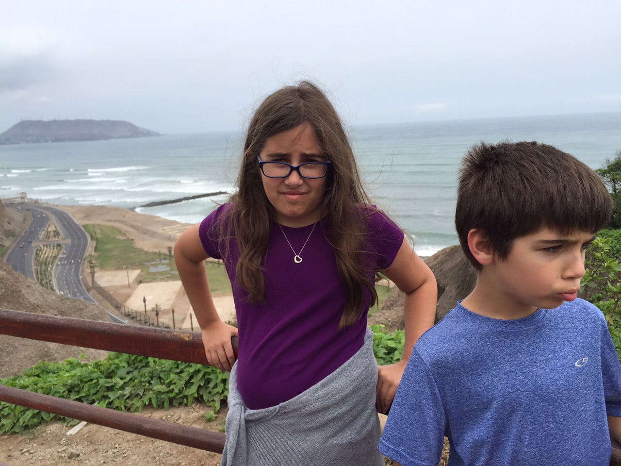 Today we set out early, at 10 a.m. We walked through the nearly empty streets of Miraflores and grabbed breakfast at a local cafe followed by shopping at the farmer’s market in San Isidro. A lot of products in the markets in Lima (not necessarily at the supermarkets) seem to be local to Peru but there are very few organic products. The Sunday Ecomarket in San Isidro draws a well heeled crowd eager to buy organic fruits and vegetables, quinoa, breads, meat and health products. We bought some bread, goat cheese and vegetables to try later. (I almost bought some kind of charcoal powder from the Amazon that promised to clear my body of all heavy metals. My Spanish isn’t that great so maybe it was actually a laxative so I didn’t buy it.) Of course we made the kids walk back to the apartment, the long way….