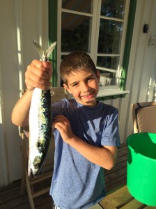 We spent another sunny day jumping into the ocean from the rocks. Oscar was the bravest of us all and jumped from the very highest diving board which is 15 feet high. We lunched high on the rocks at Bryggiven in Lyr, a restaurant on an island accessed only by ferry, played some competitive family tennis, caught a fish from the dock (a mackerel caught by Oscar), warmed ourselves in the Nösund sauna and finished it all off with a seafood feast.