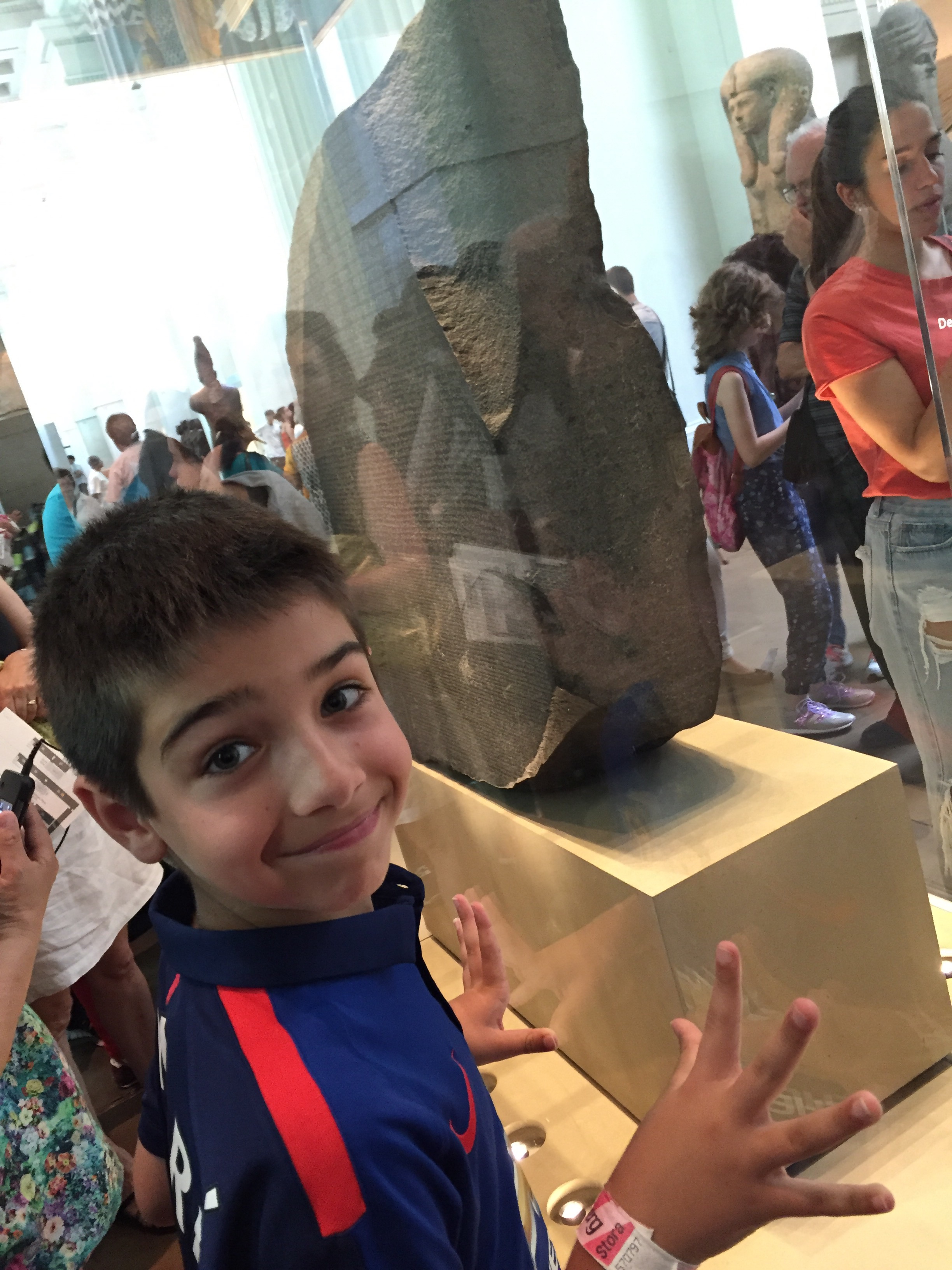 Our final full day in London was spent much the same way as our first and second: walking a lot, eating a lot and seeing some sights. Unless we are at the beach, that pretty much seems to be the formula for the Hayes family vacations. It seems to work for us! While Sean went to a meeting, the kids and I visited the British Museum. Oscar and Sofia had agreed on this musuem ahead of time, I think partially fueled by the recent Night at the Musuem movie which is set in London. The museum is enormous and crammed full of objects and tourists. It was also as hot as a sauna even at 1030 a.m. Although it is free to get into the museum, Oscar insisted that we pay extra to get into one of the special exhibits which was Sunken Cities: Egypt’s Lost Worlds. It was a fascinating look at artifacts from two recently discovered ancient Egyptian cities that had been buried under the sea for over a 1000 years. It was a great call by Oscar. Not such a great call was insisting that we visit both the money and clock exhibits (boring! At least to me and Sofia.) We of course saw the Rosetta Stone and being tourists that we are, we bought a replica magnet at the gift shop.