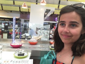 Since we were in the neighborhood, we decided to visit another tourist attraction: Harrods. The kids couldn’t quite understand who actually shopped for their food at the massive and expensively stocked Harrods food hall (I’m not quite sure I do either) but it was fun to look at all the treats. Just to say they bought something, Oscar and Sofia each had a macaron. We then walked a couple of blocks south to the Harvey Nicols department store and went straight upstairs to the Yo! Sushi counter. Sofia loves (vegetarian) sushi and was thrilled with the food and the concept. We had fun grabbing our own plates off the conveyer belt, watching to see what would come around next.